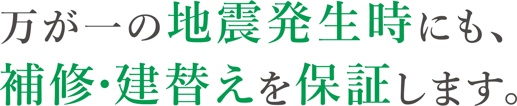 当社の住宅は、第三者機関による安心評価基準をクリアしている高性能な住宅のため、万が一地震により住宅が倒壊してしまった場合でも、建て替え費用を販売価格まで保証します。建て替え時の自己負担が発生しないため、地震発生時の住居修復に関する費用を心配する必要はありません。