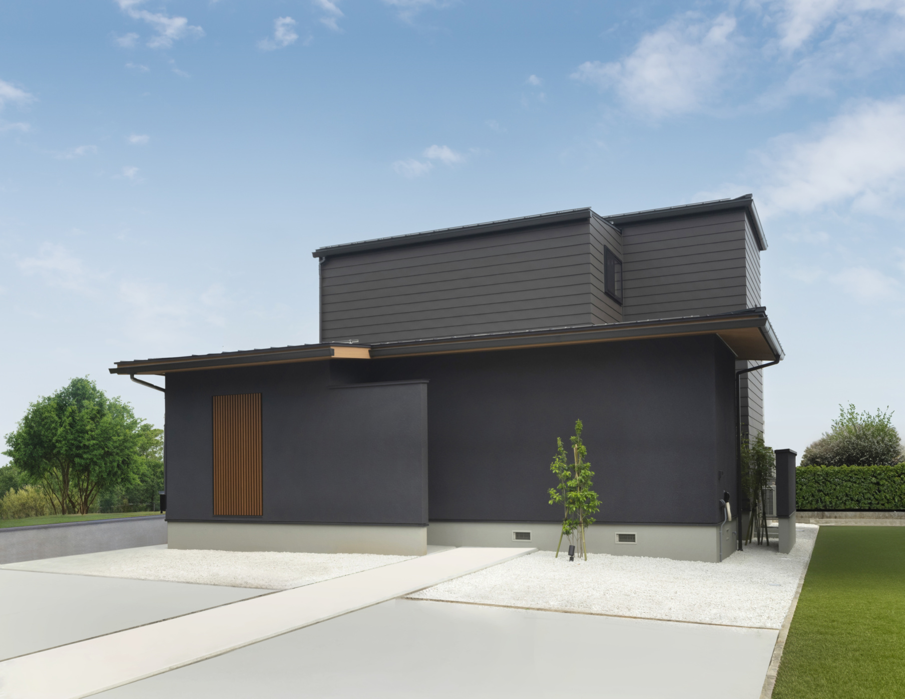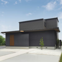 軒のない屋根にモルタル外壁とガルバリウム外壁をミックスすることで深みのある