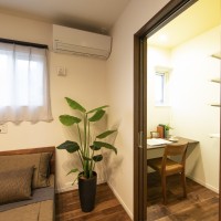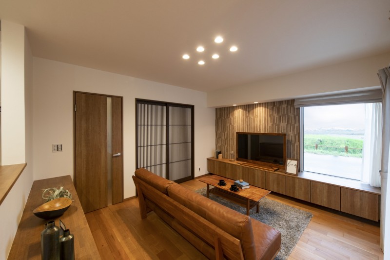玄関からリビング・水廻りスペース・和室へとそれぞれアクセスできるようにし機能的な動線としました。 床材にブラックチェリー無垢床を使用し、落ち着きのある内装になっています。 リビングTVボード横に大開口の窓を設けることで、季節感ある立山連峰の風景を楽しめるようにしました。 寝室にご夫婦別々の書斎を設けることで、テレワークやプライベートな時間をそれぞれ過ごせるようにしました。