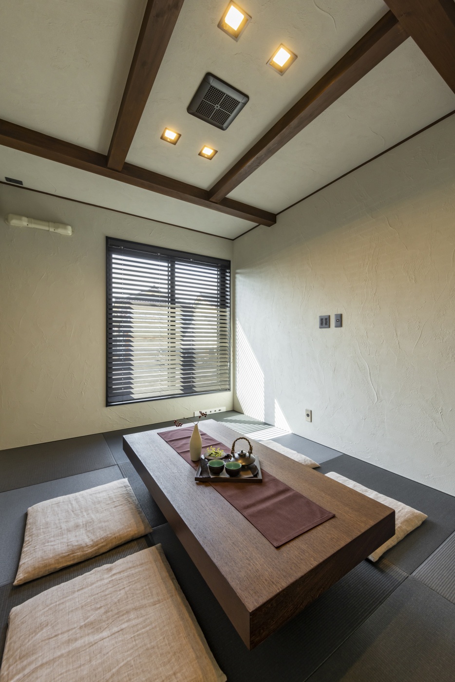 和室の壁及び天井は塗り壁仕上げとなっており、ウォールナットの化粧梁との相性は抜群です。