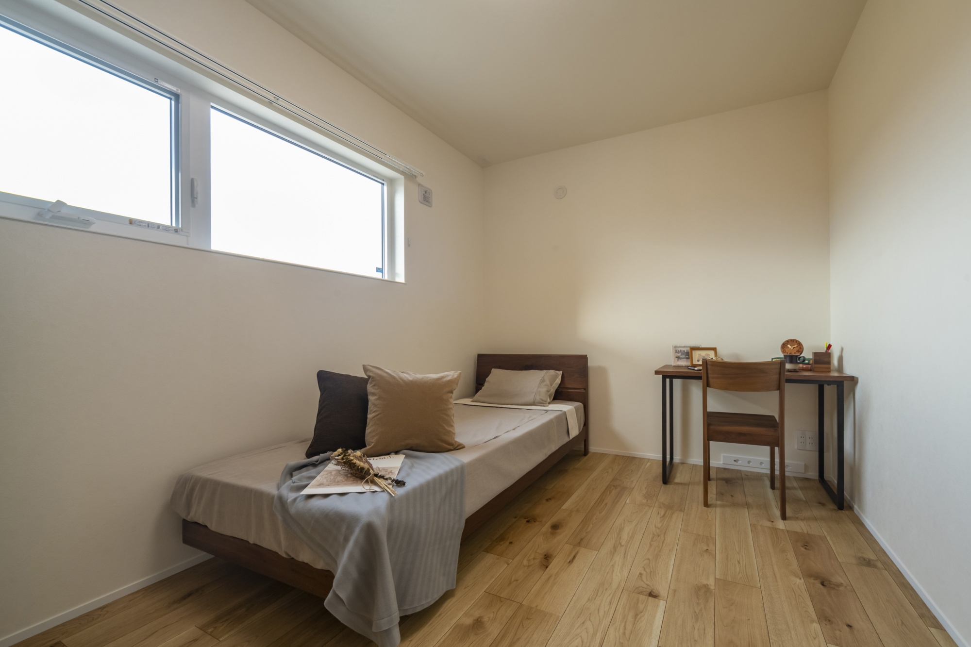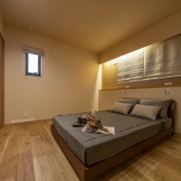 キッチンから洗面・ユーティリティなど水廻りスペースへとそれぞれアクセスできるようにし機能的な動線としました。 畳敷きのリビングから立山連峰の季節の移ろいを楽しめるようにしました。 床材にオーク無垢床、玄関とキッチン天井に八溝杉を使用し、ナチュラルで和風な内装に仕上げました。 大屋根をシャープな片流れ、ポーチ屋根を寄棟とすることでクールでも落ち着きのある外観としました。