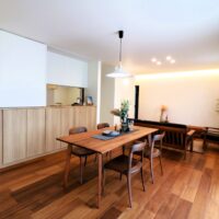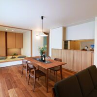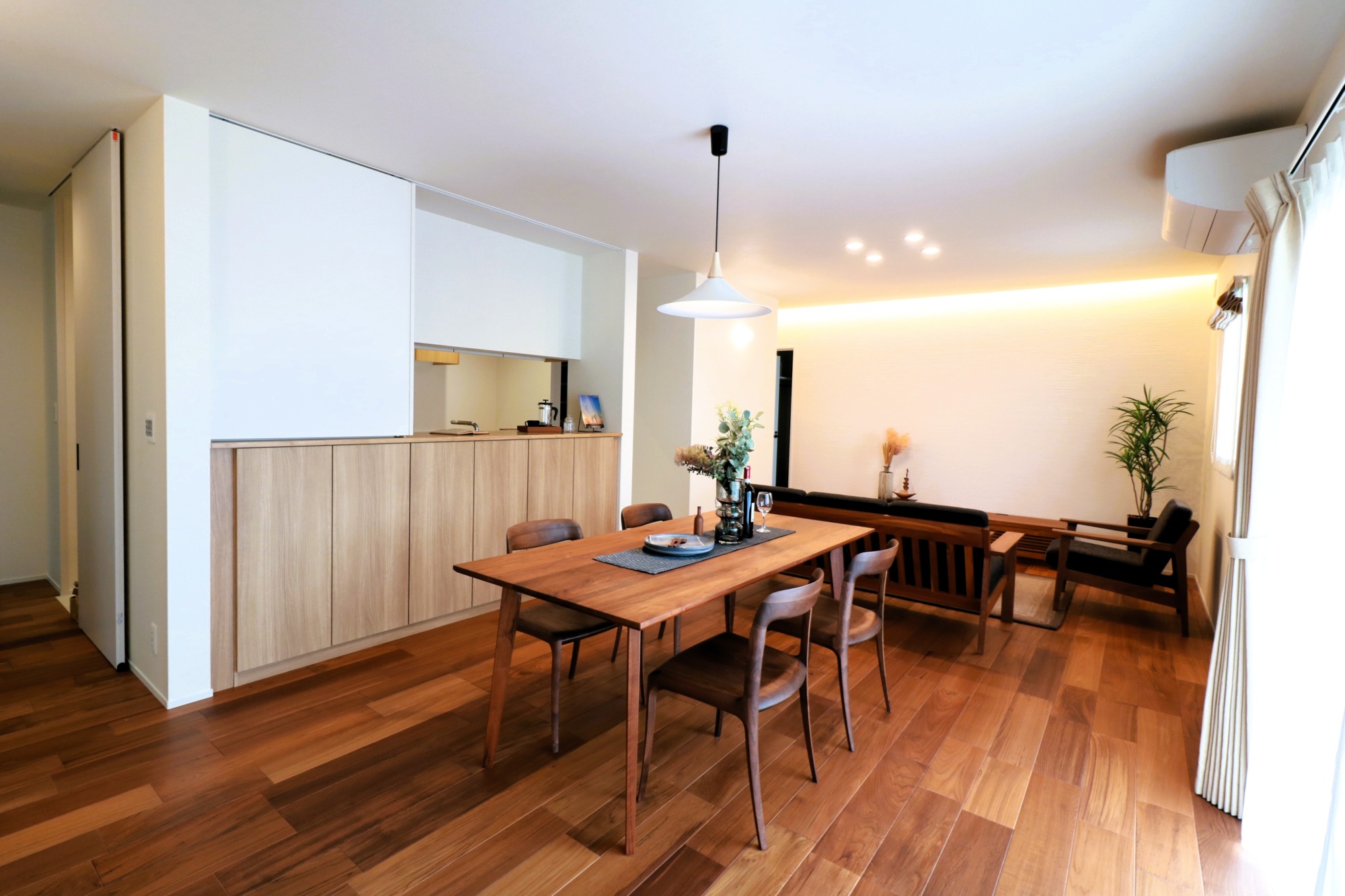 木のぬくもりとやわらかな灯りが、家族の時間をそっと包み込むリビングダイニング。