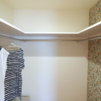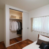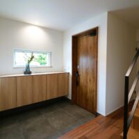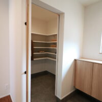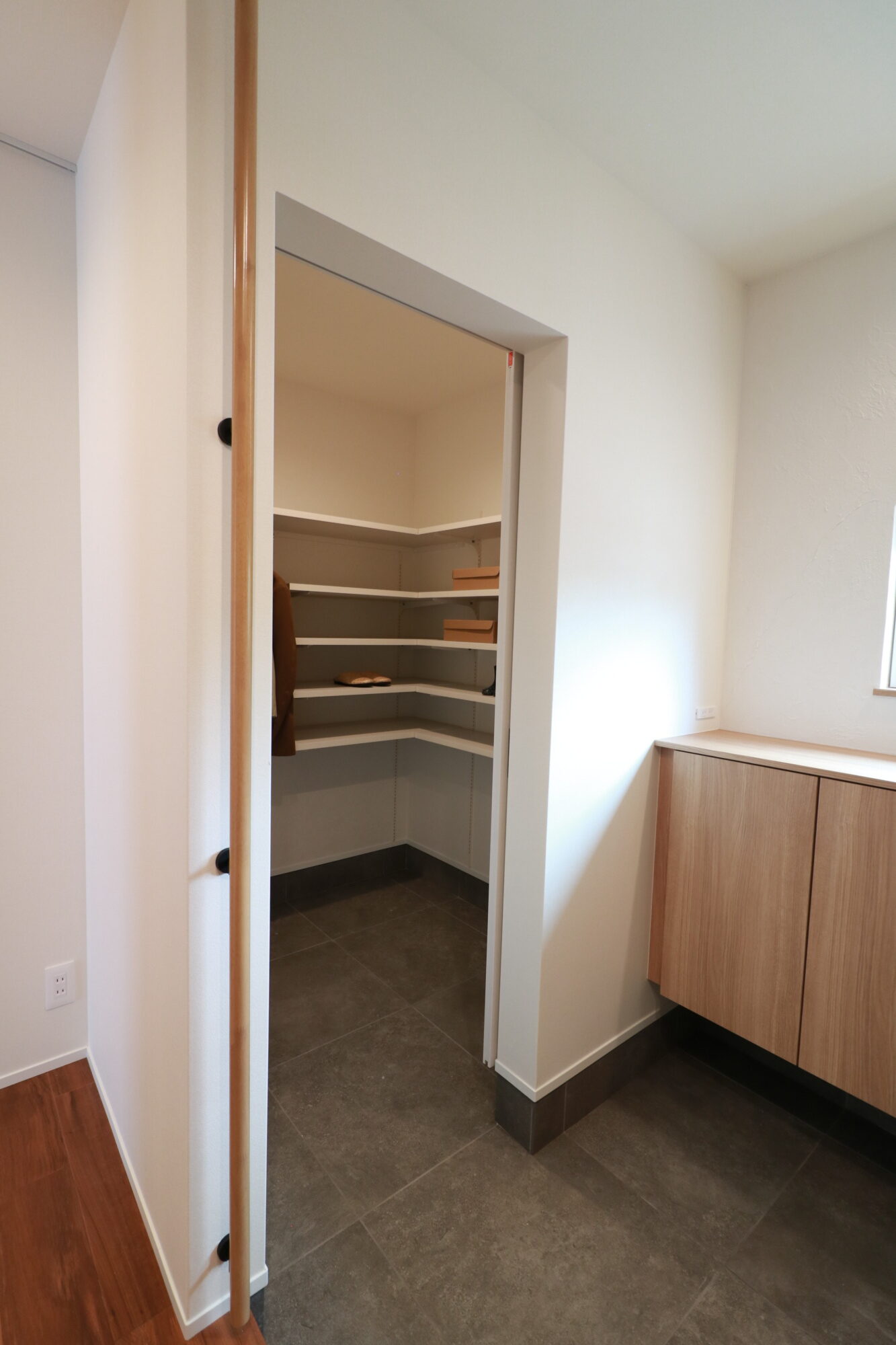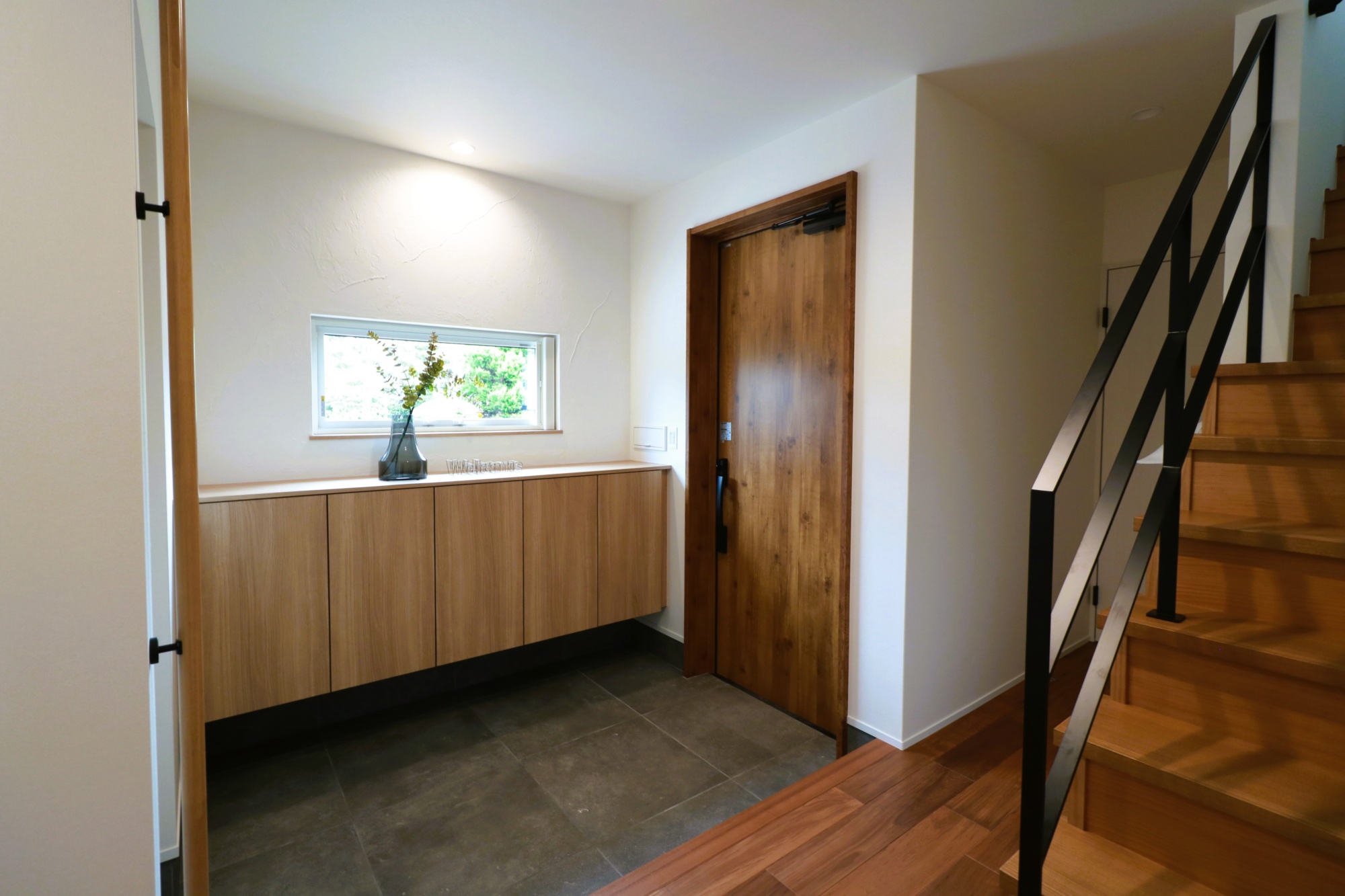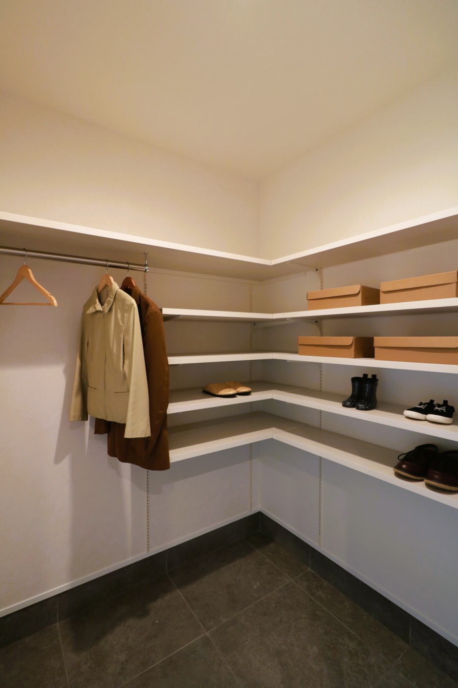 玄関のシューズクロークは扉付きで、来客時も靴や荷物が見えない工夫を。