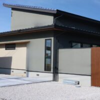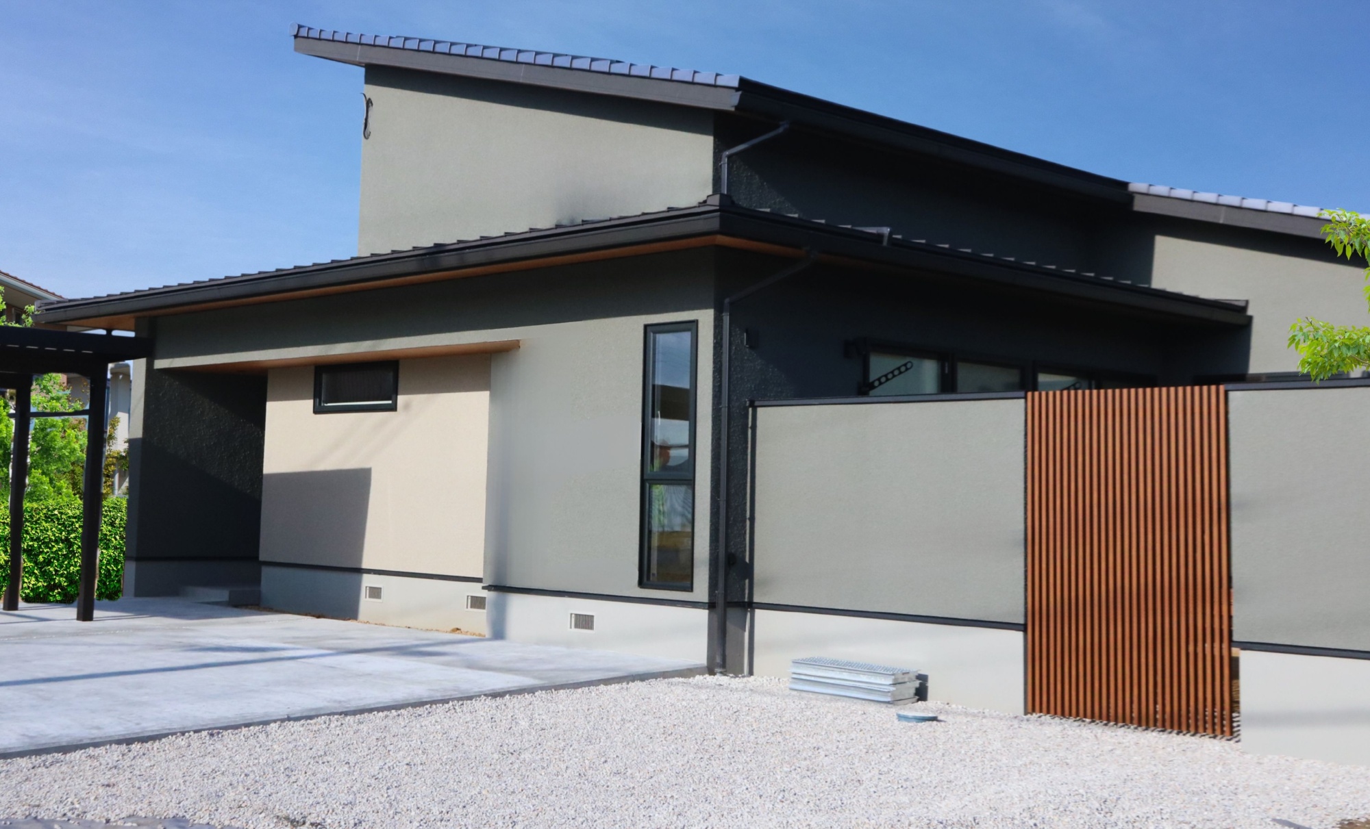 つなぎ目のないモルタル仕上げに濃淡ツートンの外観が、