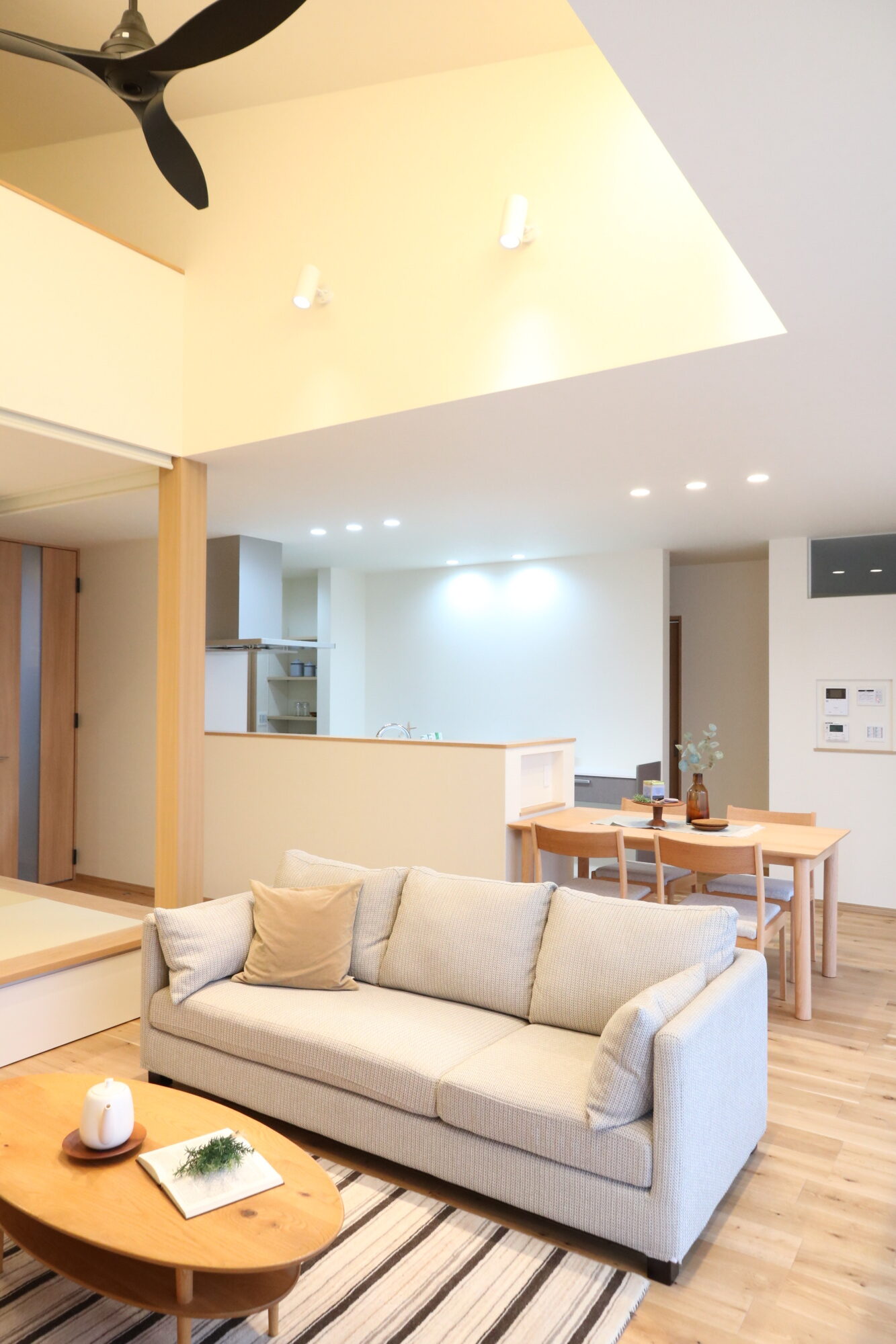 朝の光に包まれるダイニングと、高天井でのびやかにくつろげるリビング。