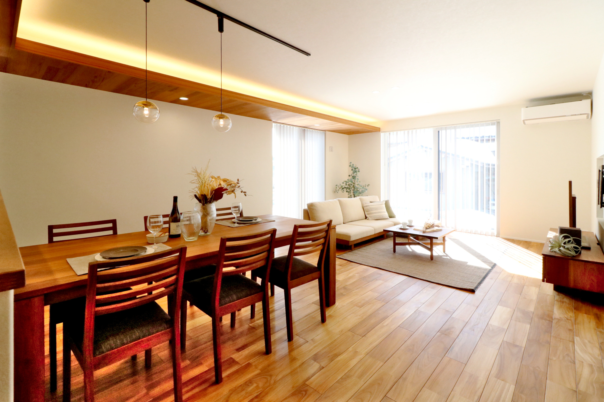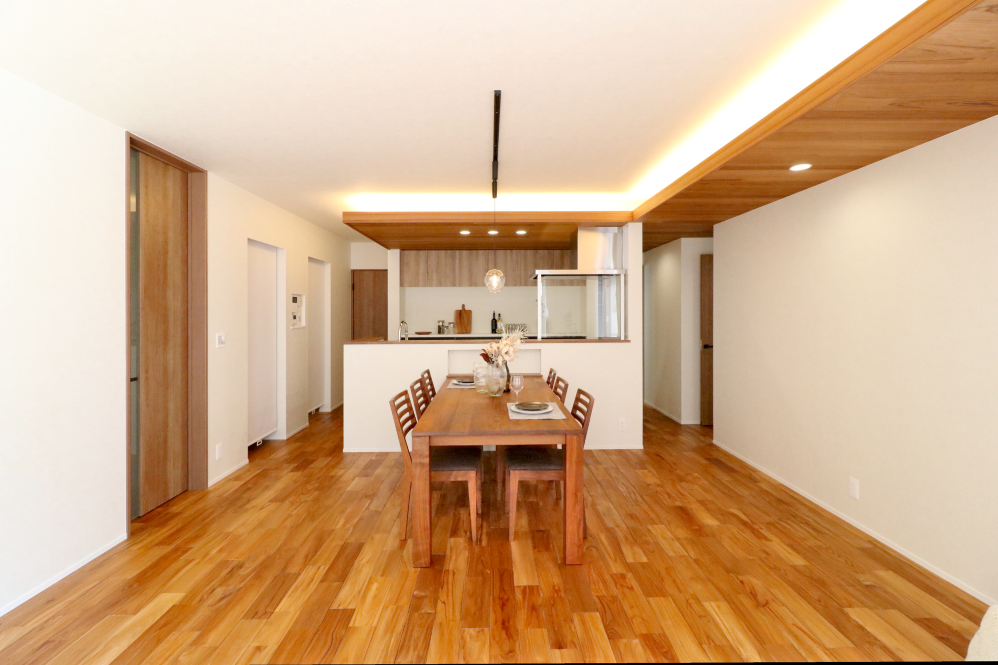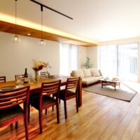 木の羽目板と間接照明がつくるやわらかな光に包まれたLDK。