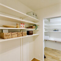 玄関からリビングへ入り、収納やパントリーを経てキッチンへとつながる動線。