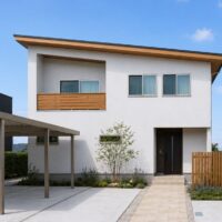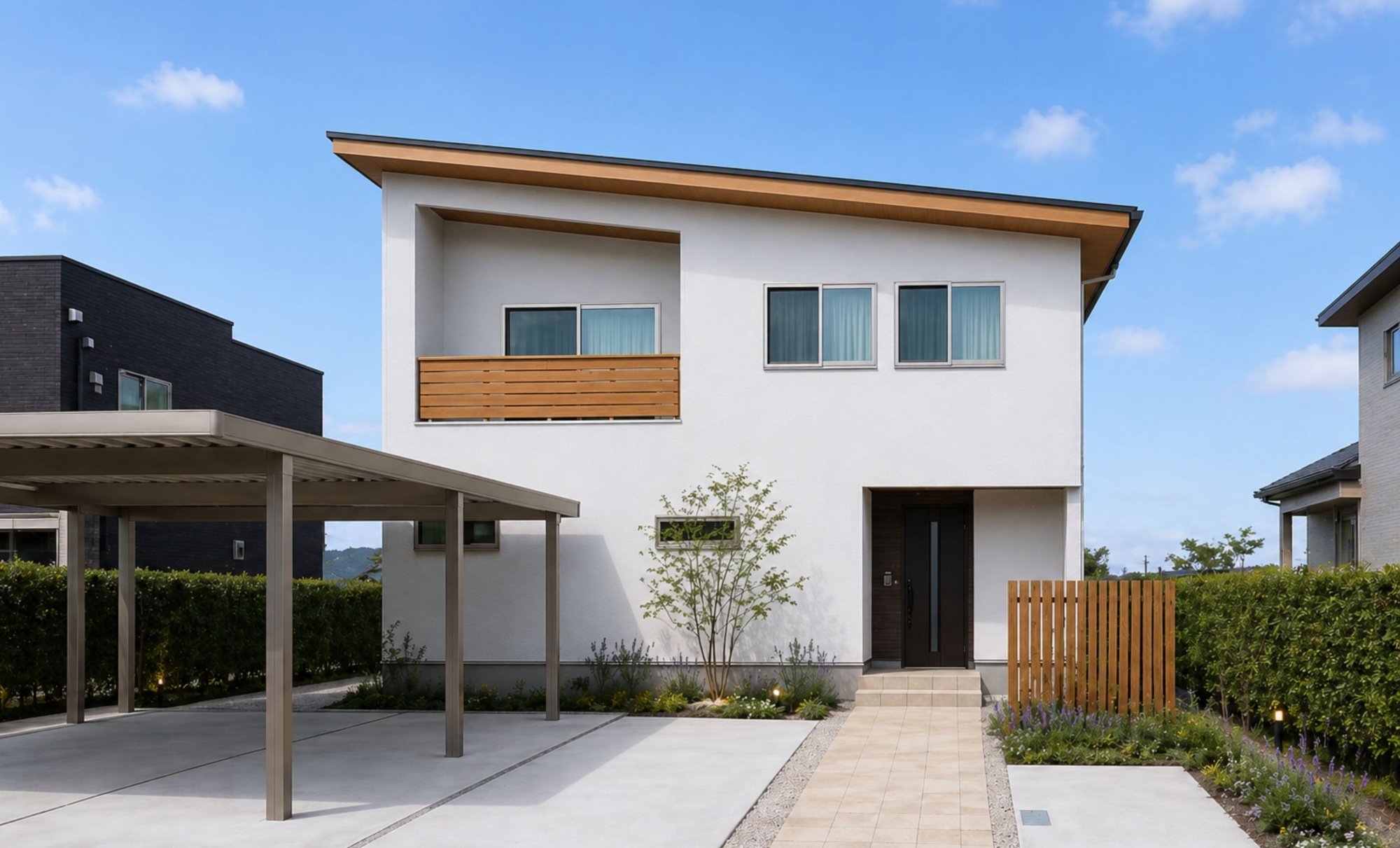 片流れの屋根ラインのシャープな外観に木目調のアクセントをバルコニーと破風・軒天に施し、シンプルモダンな外観に仕上げました。